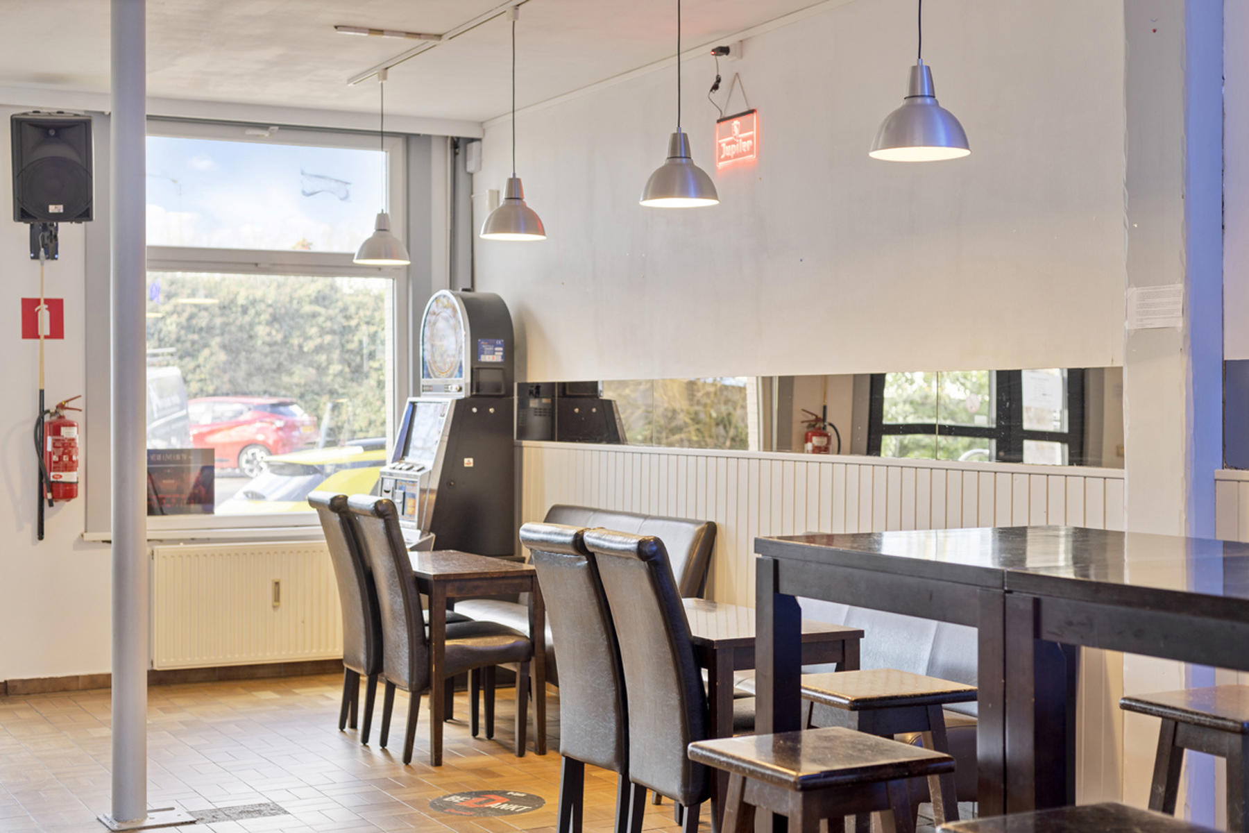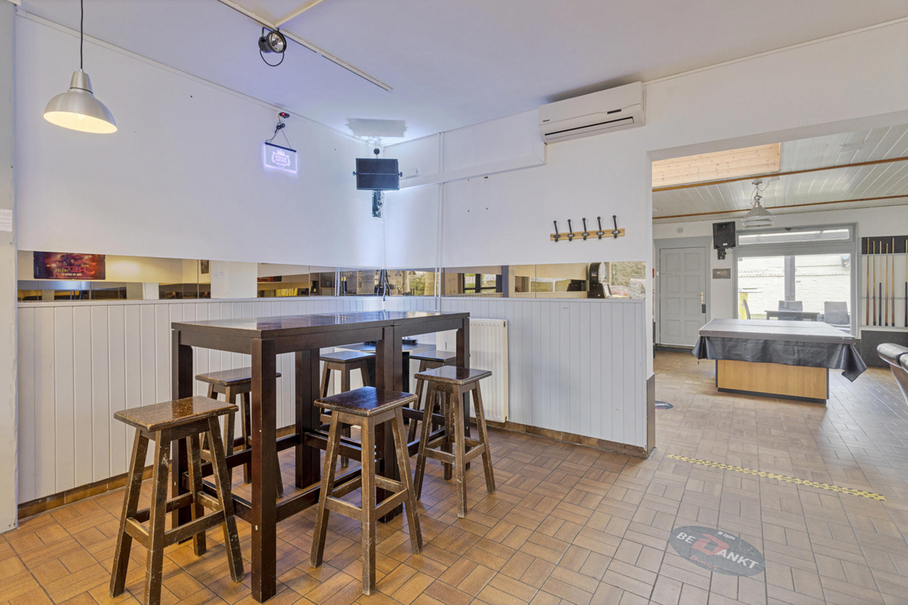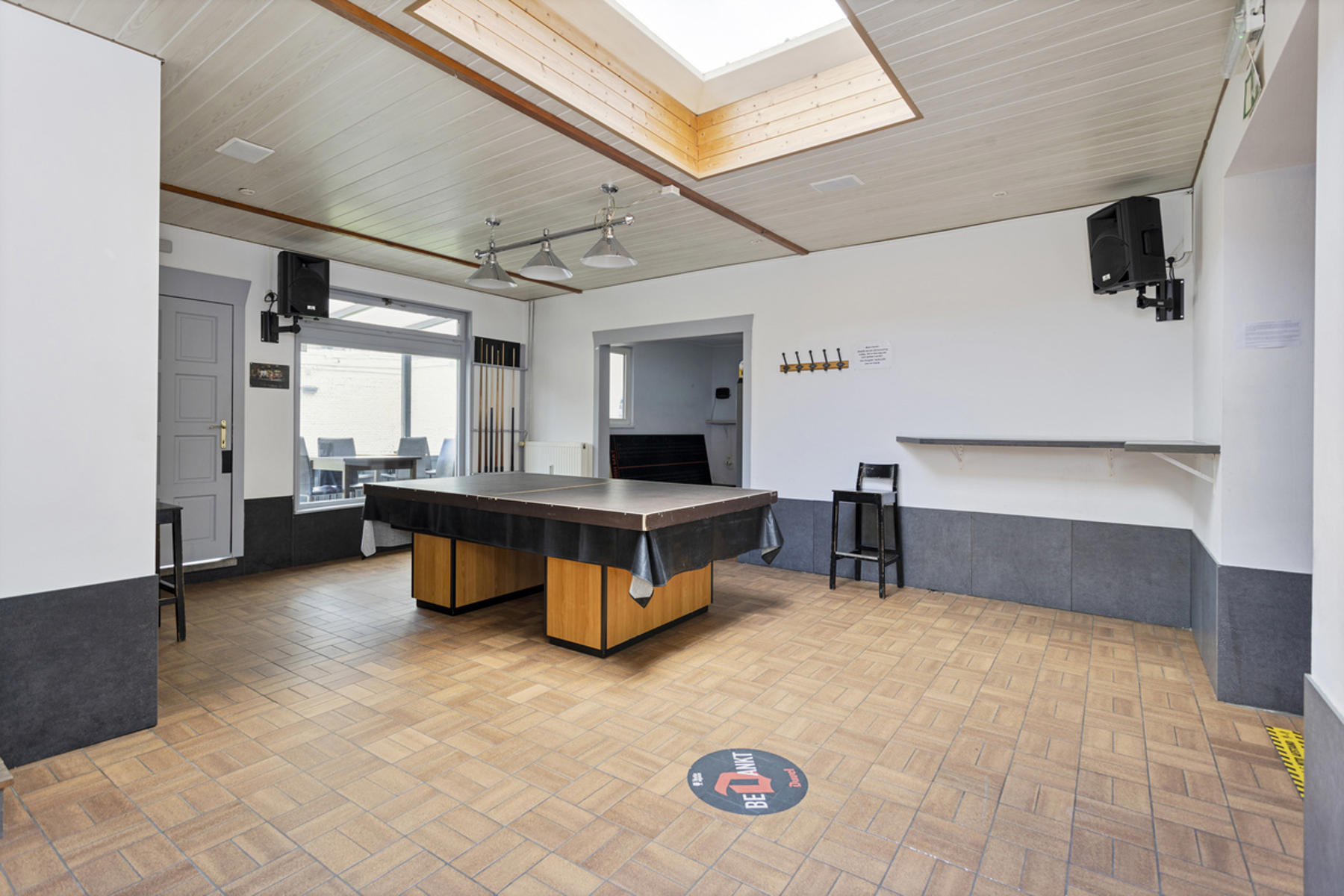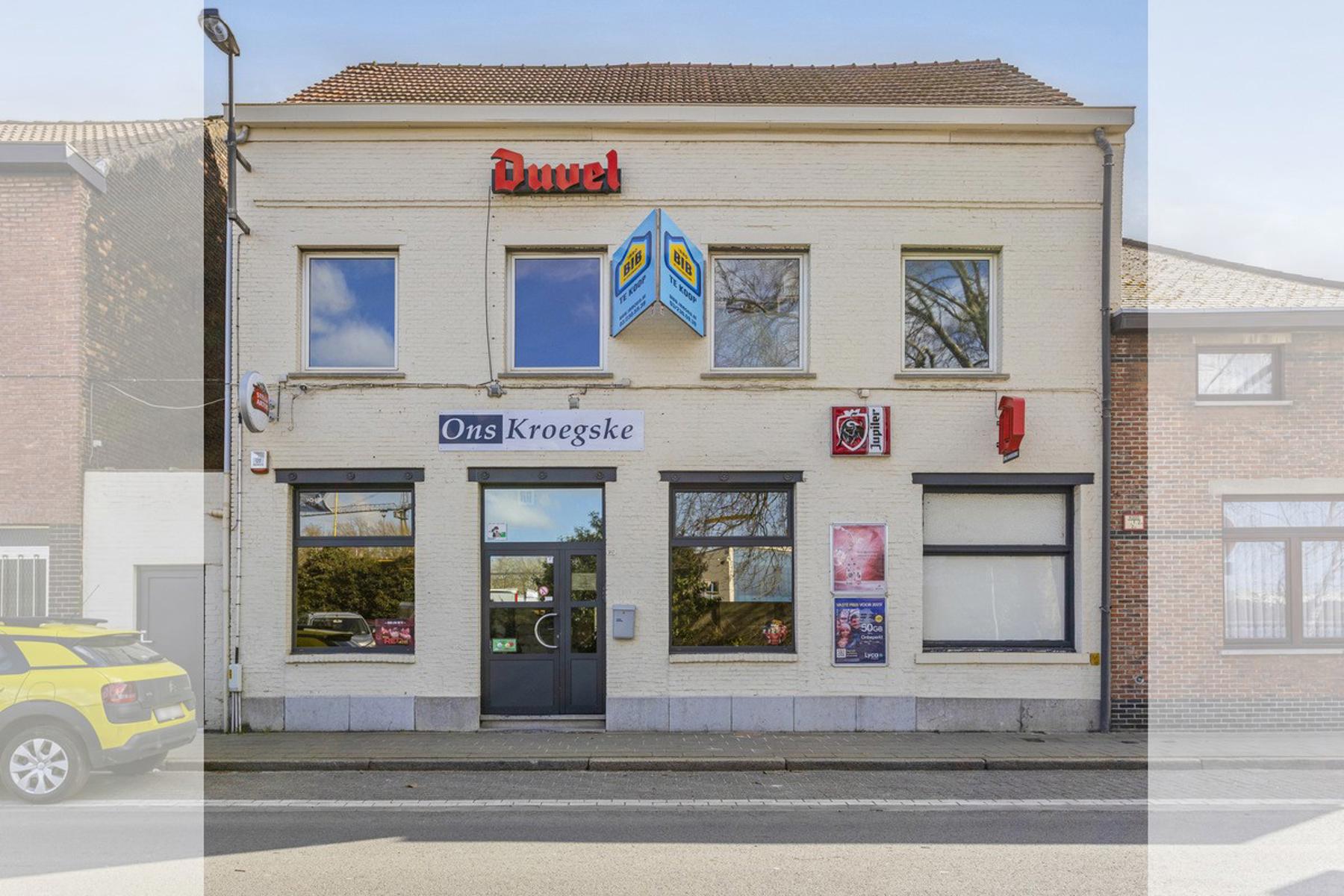 Dit handelshuis bestaat uit een groot café van 210m² en een ruim appartement van 175m². Café is uiteraard voorzien van toog, ingerichte keuken met praktische bijkeuken en sanitair voor zowel dames als heren. Achteraan is er een uiterst gezellige veranda welke zicht biedt op de grote, zonnige tuin. Op de eerste verdieping vindt men de woon- en eetkamer met aangrenzend de keuken welke werd ingericht met een gasfornuis, oven, dampkap, spoelbak en ijskast. De badkamer is voorzien van douche, lavabomeubel en toilet. Tot slot is er de grote zolderverdieping van 70m² welke men naar wens kan inrichten.