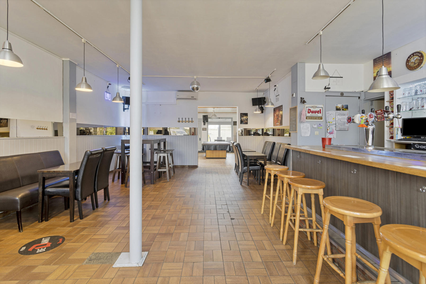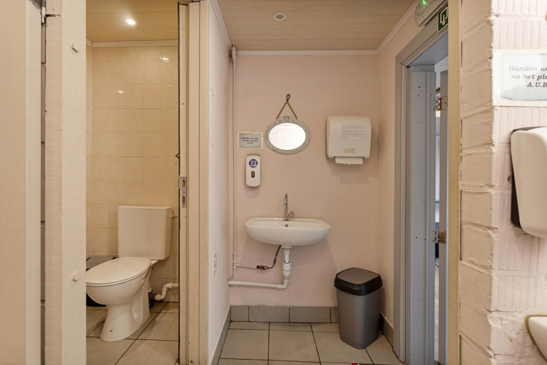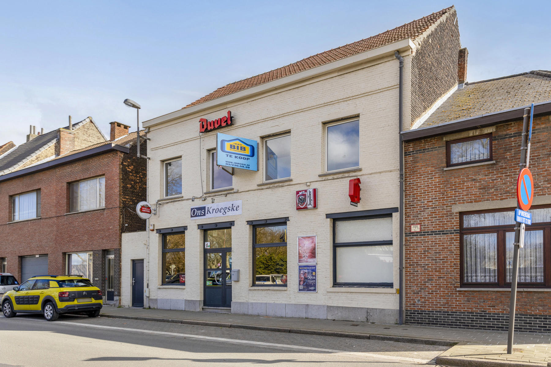 Dit handelshuis bestaat uit een groot café van 210m² en een ruim appartement van 175m². Café is uiteraard voorzien van toog, ingerichte keuken met praktische bijkeuken en sanitair voor zowel dames als heren. Achteraan is er een uiterst gezellige veranda welke zicht biedt op de grote, zonnige tuin. Op de eerste verdieping vindt men de woon- en eetkamer met aangrenzend de keuken welke werd ingericht met een gasfornuis, oven, dampkap, spoelbak en ijskast. De badkamer is voorzien van douche, lavabomeubel en toilet. Tot slot is er de grote zolderverdieping van 70m² welke men naar wens kan inrichten.
