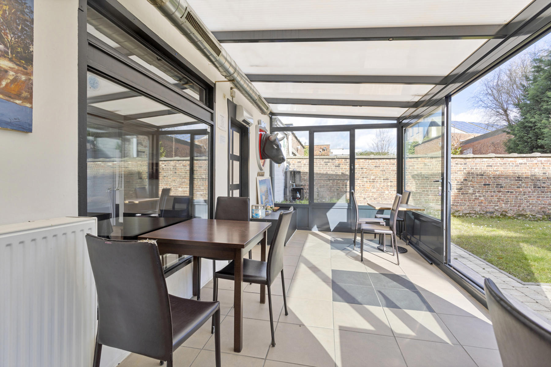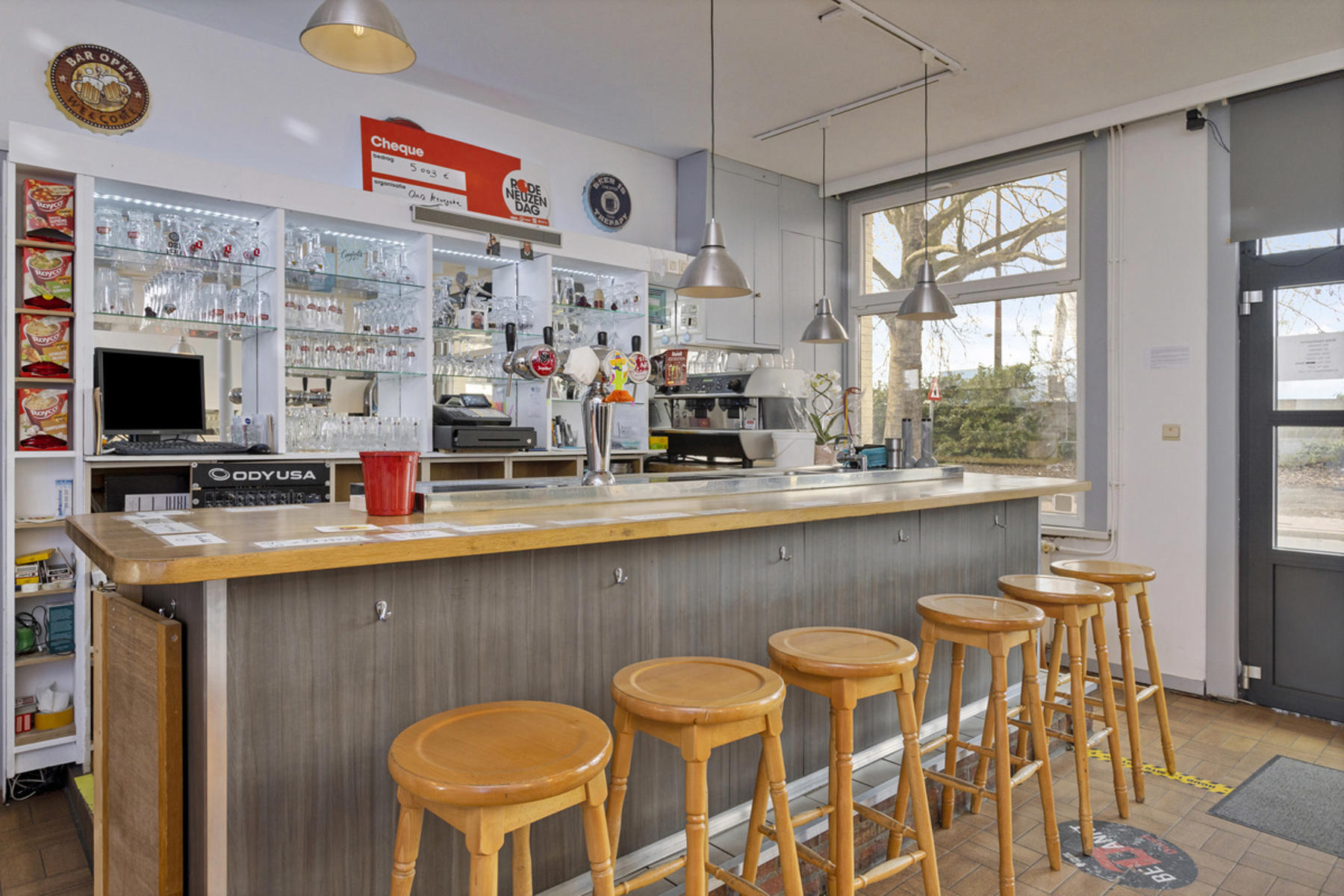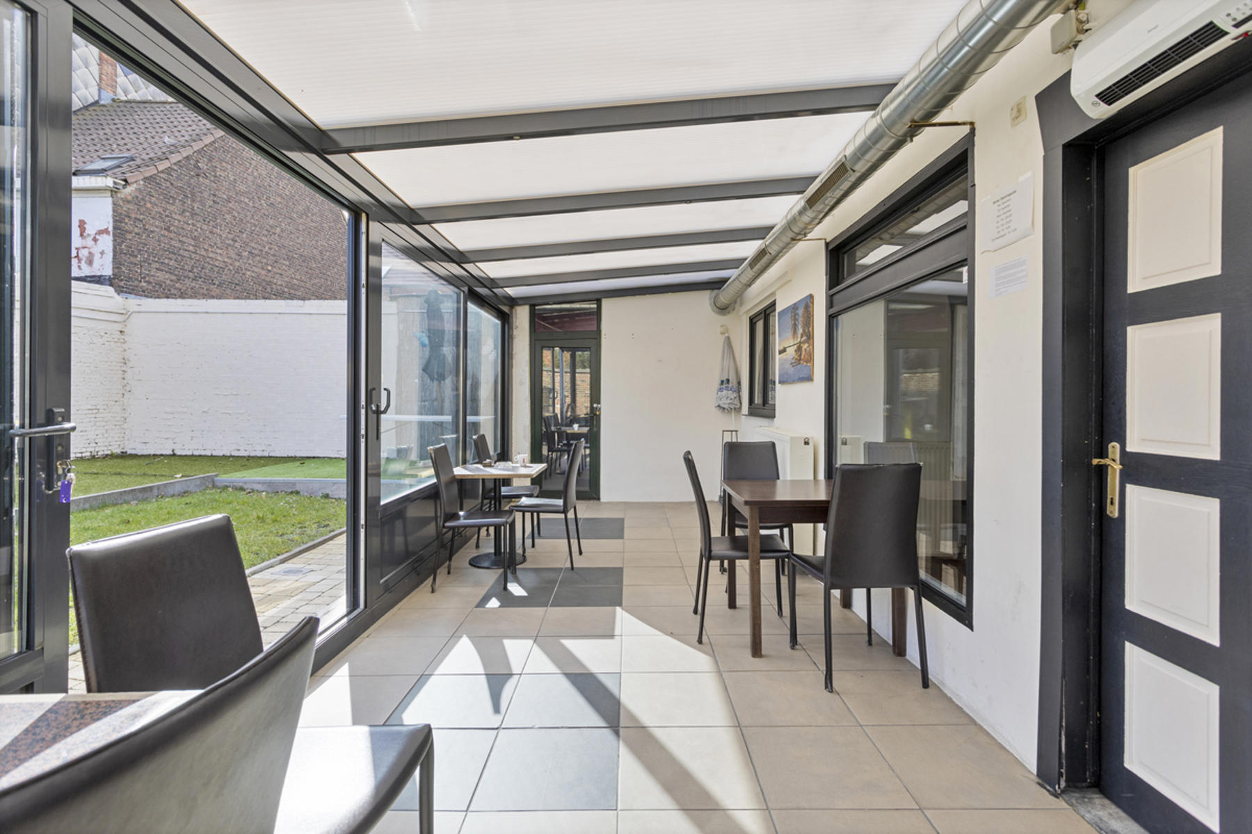 Technische gegevens café: voornamelijk hoogrendementsglas in aluminium of PVC, collectieve centrale verwarming op gas en individuele centrale verwarming op elekticiteit (warmtepomp lucht/lucht)